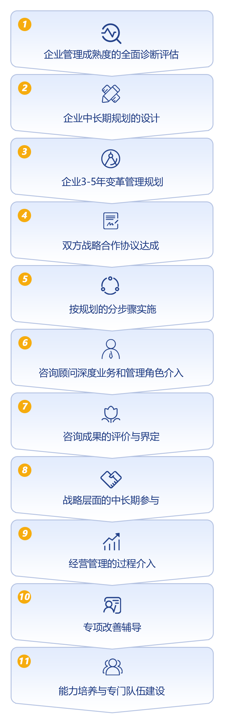 企业治理成熟度的周全诊断评估 企业中恒久妄想的设计 企业3-5年厘革治理妄想 双方战略相助协议告竣 按妄想的分办法实验 咨询照料深度营业和治理角色介入 咨询效果的评价与界定 战略层面的中恒久加入 谋划治理的历程介入 专项改善向导 能力作育与专门步队建设